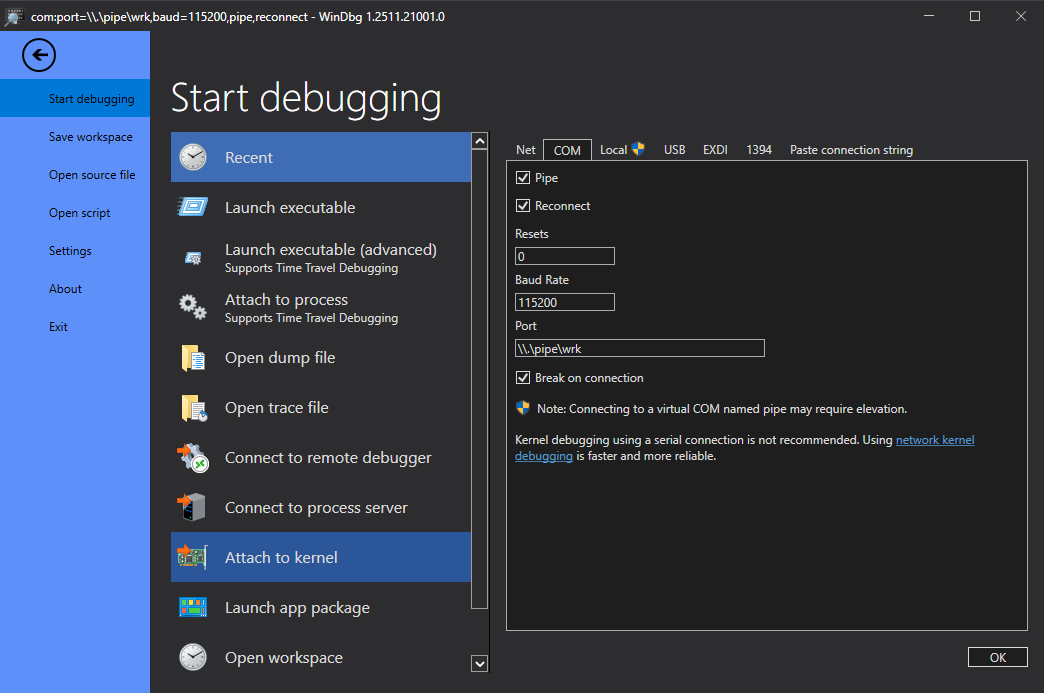 Remember we chose COM1 in the boot config, so it has to be COM1 here as well.