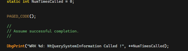 First exercise the WRK Assignments propose is to modify NtQuerySystemInformation, so let’s do that to verify everything is working, I have made this modification which is the same as in the lab documents.
