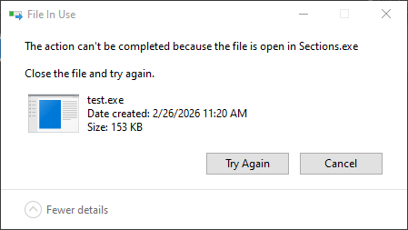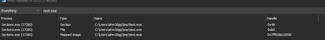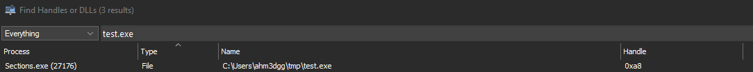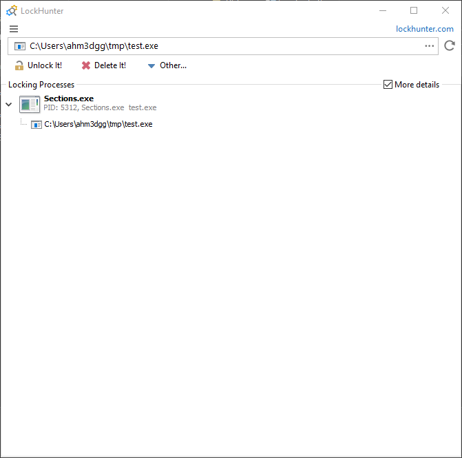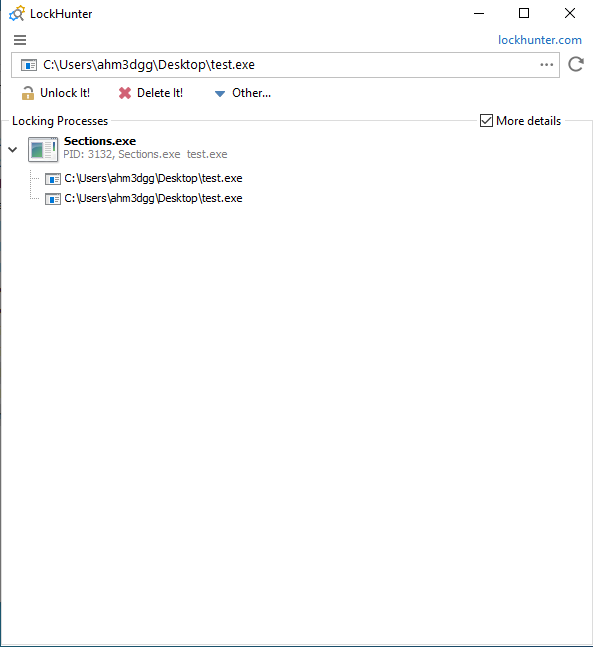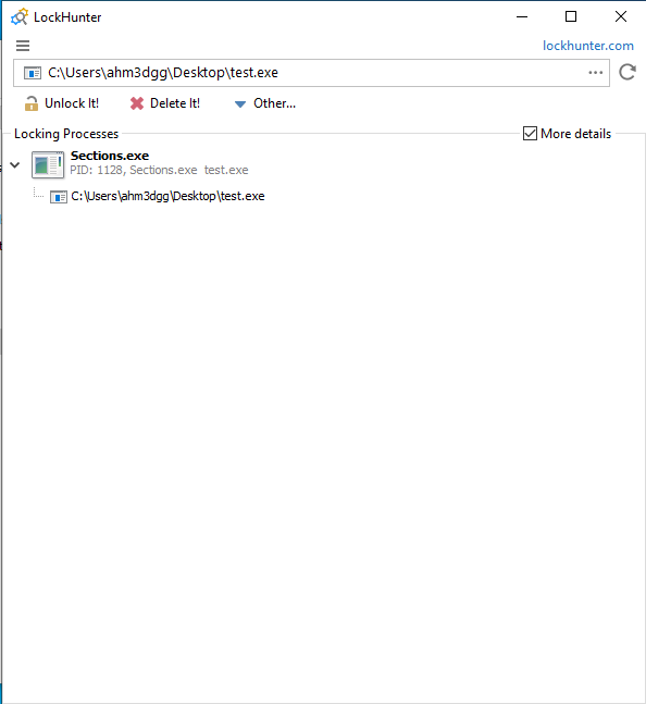 If I run this program (which I named Sections.exe) against some test executable I named test.exe, and then launch LockHunter on that file, we should see