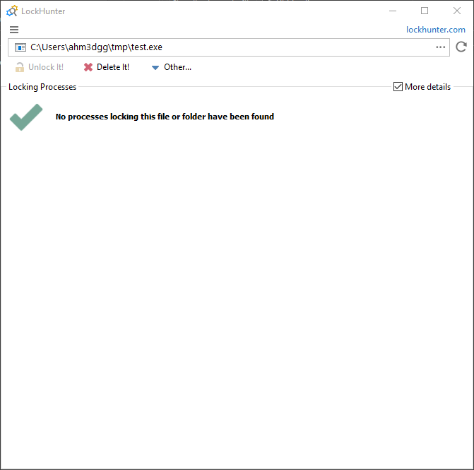 So maybe let’s try closing the file handle and see if that works—and run LockHunter on the file again. When we do, we’re faced with the green checkmark; surely the file is unlocked and we can do whatever we want.