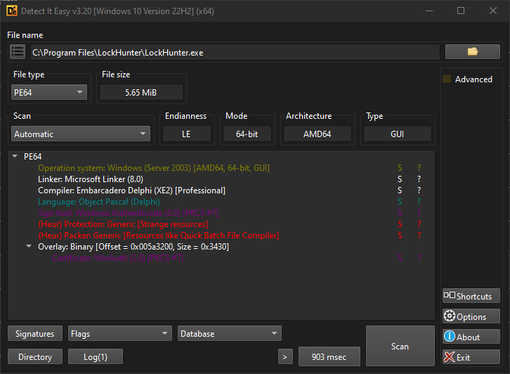 LockHunter is written in Delphi, as we can see from Detect It Easy Tool.